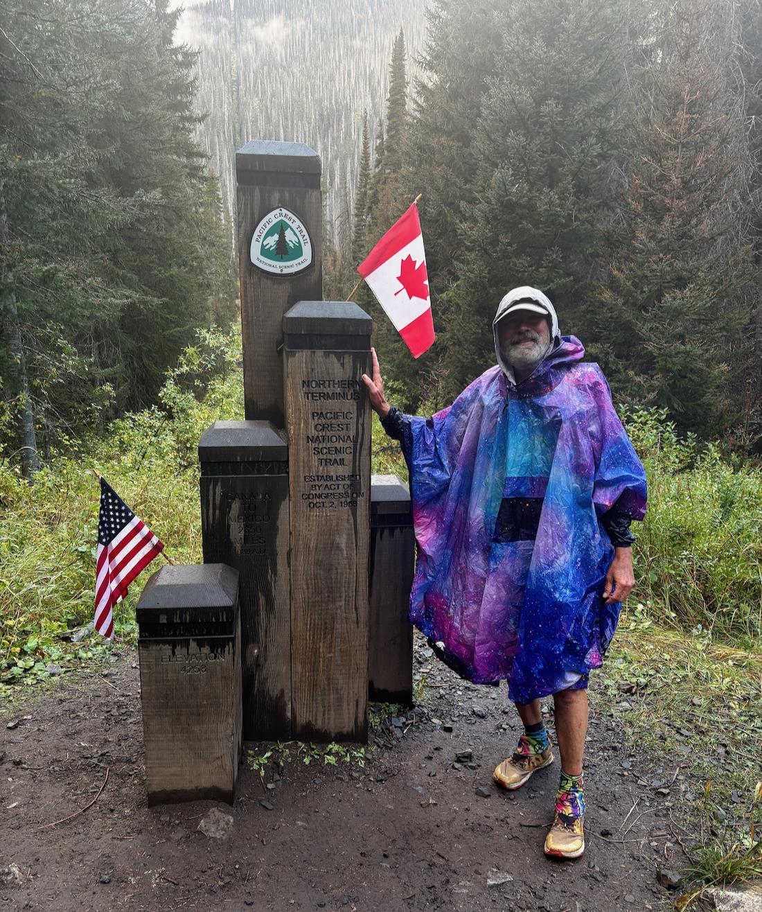 Saphirose poncho keeping me dry (but not warm) at the PCT northern terminus, Sep 2025