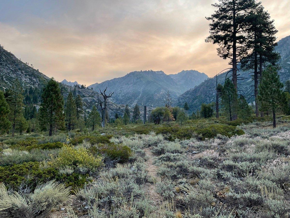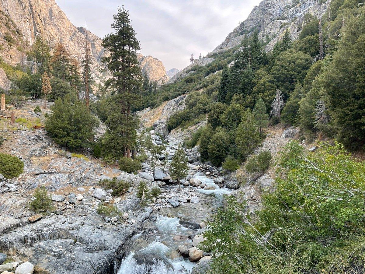 The trail itself is good, blasted right into the canyon wall, but every switchback has at least one massive downed tree blocking the trail. Off with the pack, push it under the tree, then lie on my back and push myself, or crawl, under the tree. Walk a couple hundred feet and repeat. Perhaps fresh on a morning climb it is “rough, some downfall,” but after hiking seven hours it’s a major pain in the ass. At some point I hurdle the last, and the grade and obstacles ease for the final mile to the camp area at Bubbs Creek.