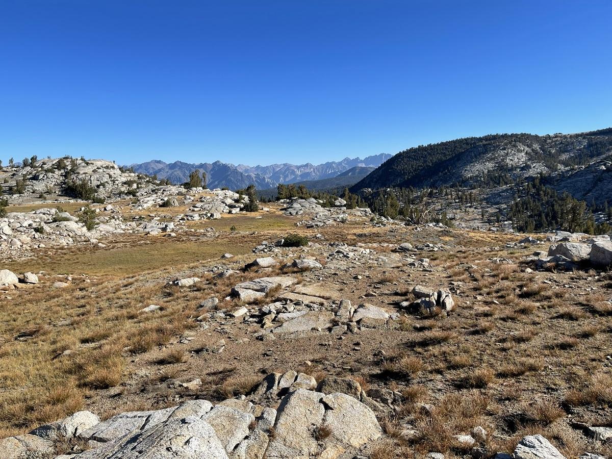 Beyond Granite Pass the trail descends gently, passing the signed, little-used trail to Kennedy Pass and the signed trail to State Lakes. I am not 100%, so take an extended noon break at Dougherty Creek. Being the last water until Simpson Meadow, I drink two liters and head out carrying four. After a short 500-foot climb I reach today’s “halfway” point: the cairn marking the northern end of the State Lakes Loop, and the start of the 5-mile, 4,500-foot descent of the Bitch Trail.