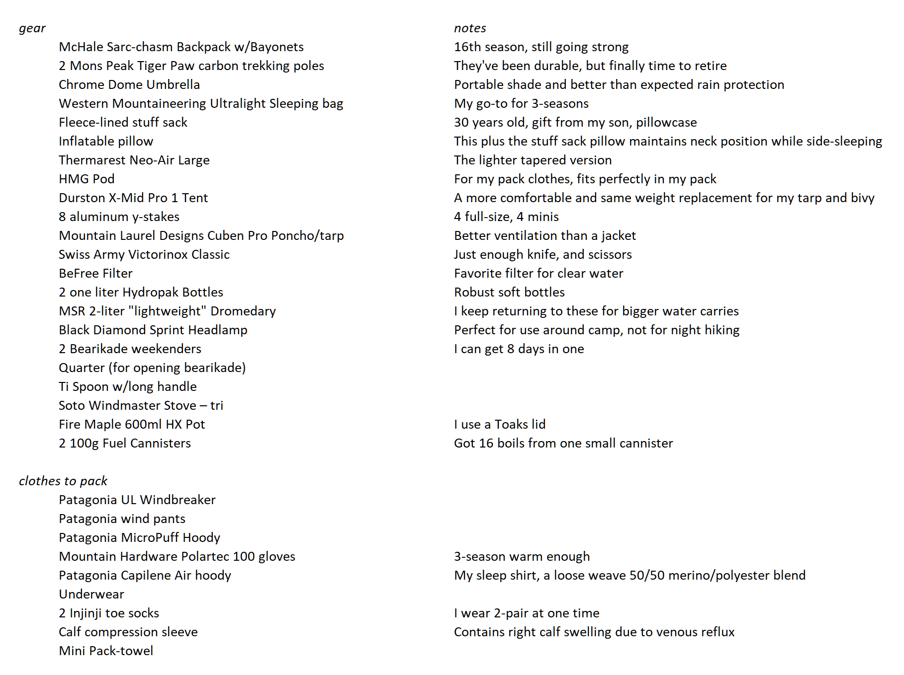 Two big changes this year. First, I replaced my tarp and bivy with a Durston X-Mid 1 Pro. For about the same weight and footprint, I get more complete coverage. It hasn’t been all-night deluge tested as my tarp has, but I’ve no reason to doubt it’s storm-worthiness. I must still choose sites carefully and “deadman” the stakes in the wind.