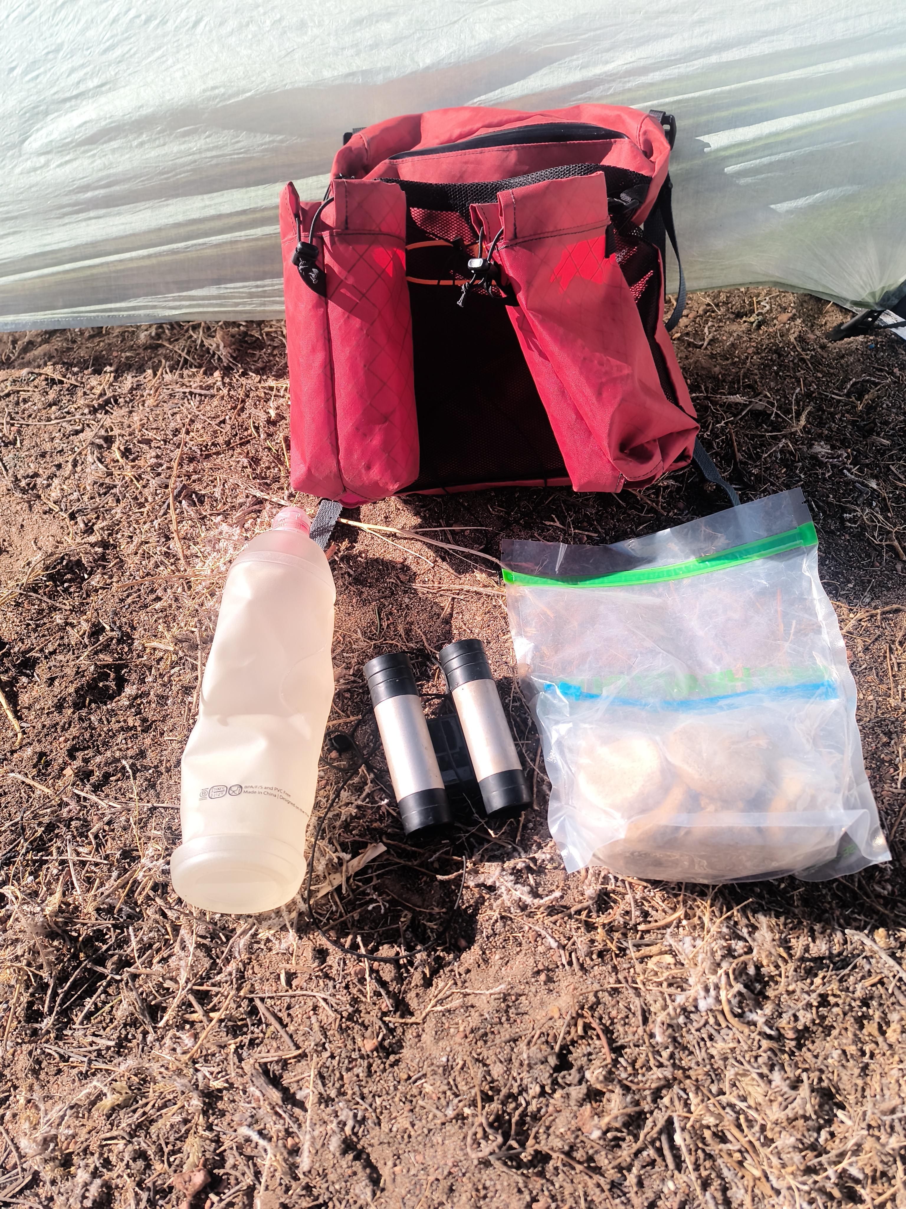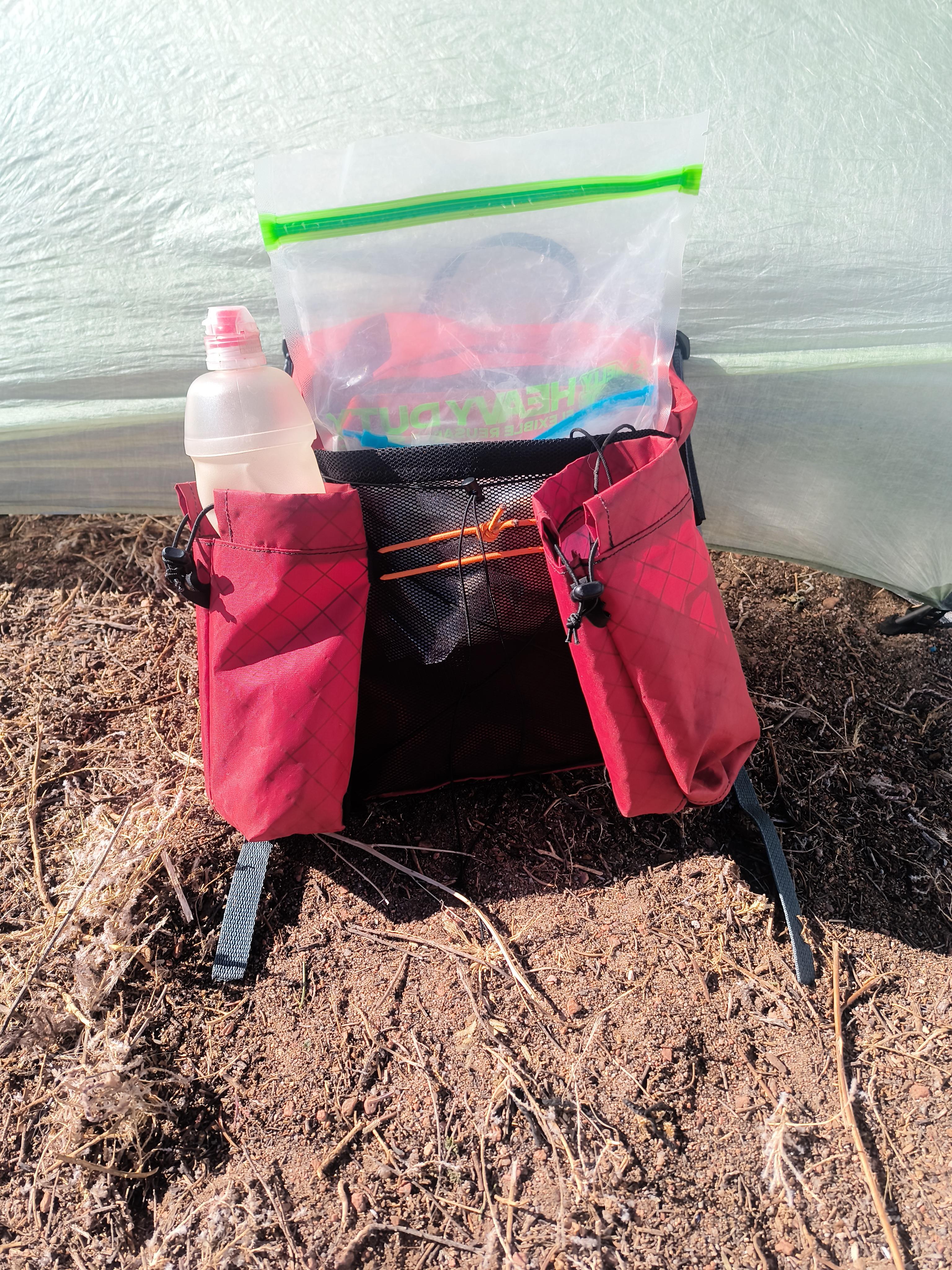 I added straps to attach it to my backpack shoulder straps that are long enough to flip it back over my head as well as swing it aside to put the pack on. Then two more straps that go to my hip belt. I was able to attach a water bottle pocket though it’s really not specifically designed for it. Easy to remove and attach to other backpacks.