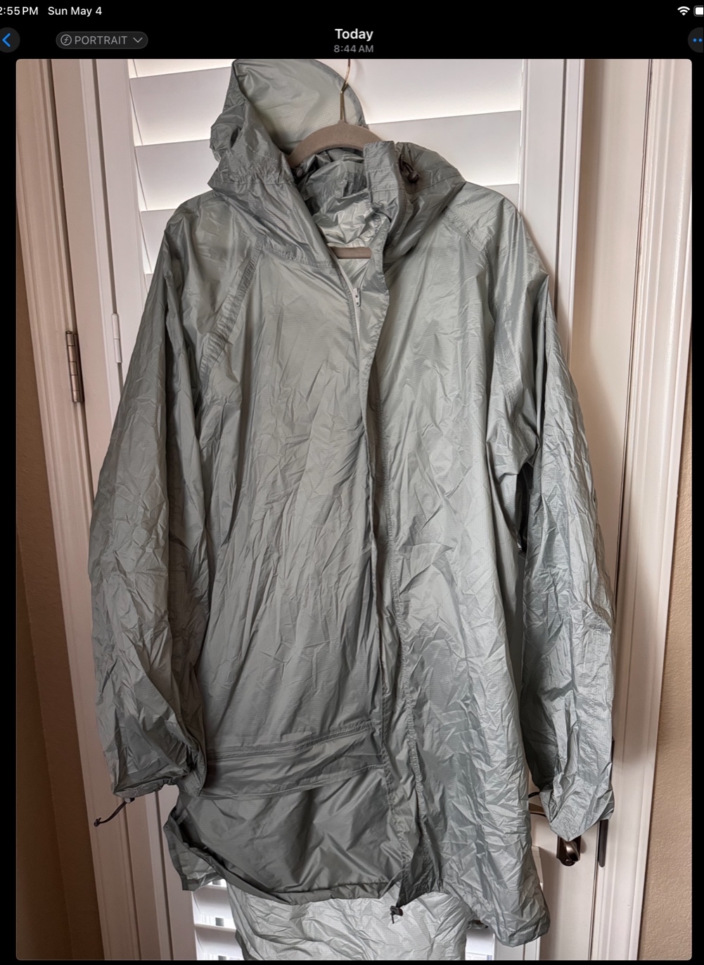 I bought this poncho new to use on my AT thru hike attempt. I tried it for one rainy day in the neighborhood, and though it worked very well, I chose to go a different direction. It is in new condition without the tags. It’s the 15d version of the poncho. It is a size medium, and it weighs 11 ounces. I am currently home recovering from an injury sustained on the AT, though I will be heading back to the trail on May 13 and will have to close this listing at thy time since I will not be availble to complete the sale after that time.