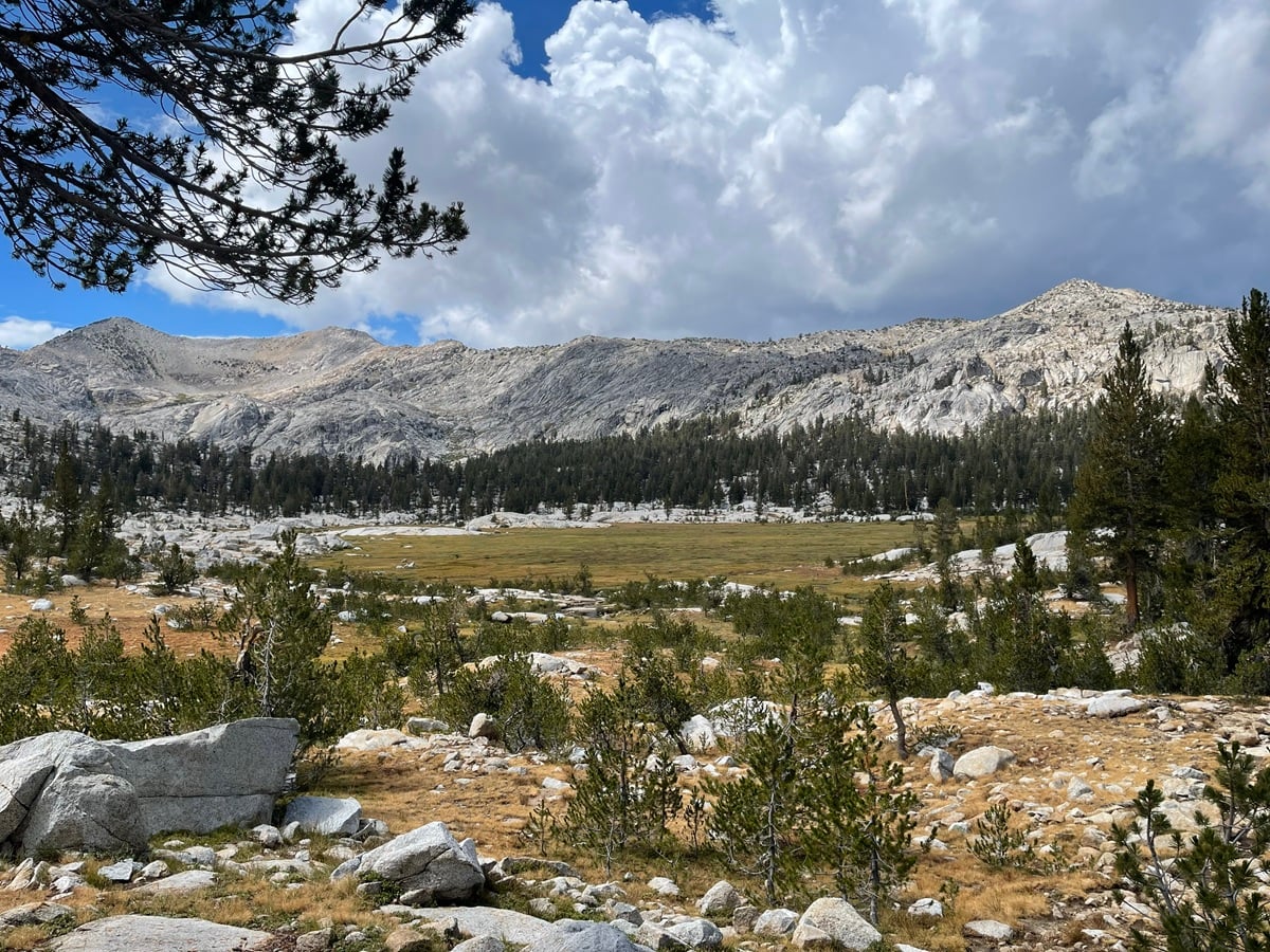 The trail ascends gently through Vidette Meadow, then climbs steadily after crossing the tributary draining Center Basin. I take a late mid-day pause before the climb. When I reach the campsite, I find the PCT’ers setting up. Tonight, then, mine will be exposed, and possibly wet, with a storm brewing overhead.