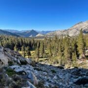 Descending Glen I enter “the zone,” an effortless walking rhythm and absence of conscious thought. Miles pass without notice. I wake at the appearance of people near the Kearsarge junction, among them a tramily of PCT’ers returning to finish, after skipping the early-season Sierra. We leapfrog most of the day.