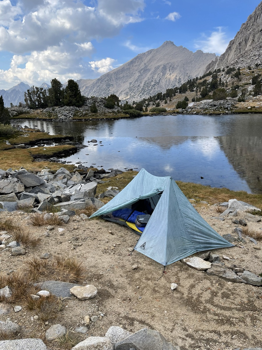 A woman is out adjusting guylines. I ask if she knew of sites among the boulders above her camp and she replies, “No, it was raining, we saw this spot and only worried about getting our tents up.” She has no issue with me looking around. I find a site a short distance away, and I’ll be able to walk around her camp to access water at the lake. I send an inReach message “At tonight’s campsite – Palisades Lakes.”