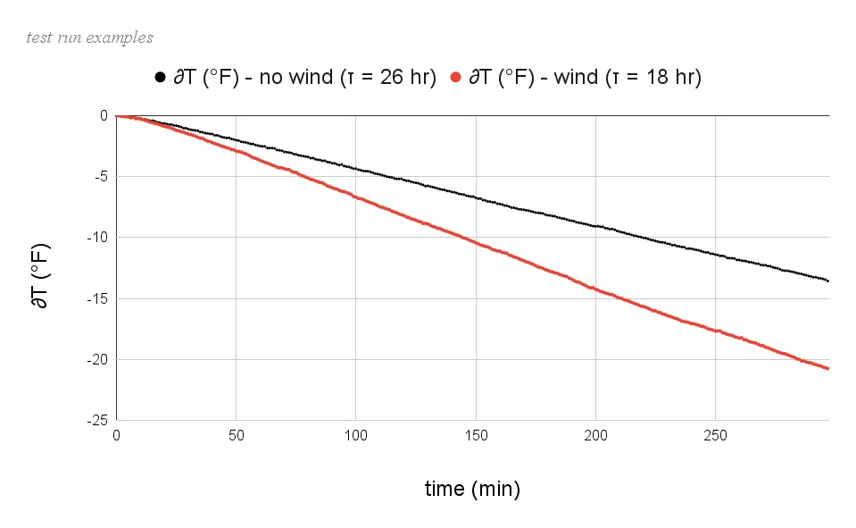 To move this discussion from theory and product marketing into measured behavior, a controlled proof-of-concept experiment was conducted using a heated-water reservoir on an insulated sleeping pad, with two different quilt-pad coupling strategies and standardized lateral wind exposure at pad height. Reservoir and ambient temperatures were logged over time and analyzed using a simple lumped-capacitance model to estimate a thermal time constant tau (τ) for each configuration. For a fixed thermal mass, tau (τ) is proportional to overall thermal resistance, so differences in tau (τ) between test conditions can be interpreted as differences in how effectively each quilt-pad system resists heat loss, both in still air and under a 4-5 mph side breeze.